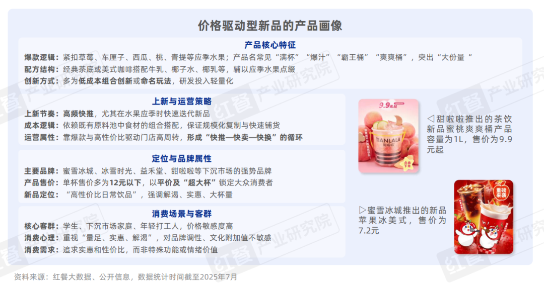 价格驱动型新品的核心特征是以低价、大杯量为基础,通过应季水果与经典茶基底、咖啡基底的快速组合,制造爆款与应季新品,满足高频、解渴、性价比消费场景。