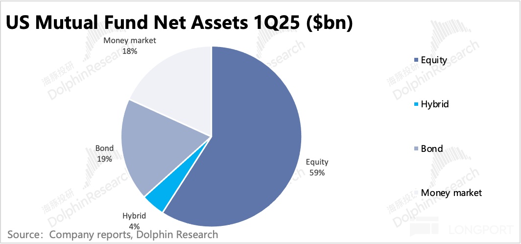 截至2024年末,美国共同基金达到39万亿美元规模(包含FOF则为42万亿),是全民财富的26%,在居民金融资产中占比30%。全行业存续基金10678只(包含ETFs),共同基金以股票基金为主,占了近60%。