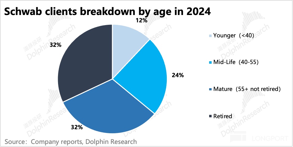 对比同行,在用户渗透率上嘉信虽然还不是全美第一,但综合来看,妥妥行业TOP。以2024年末的数据为例: