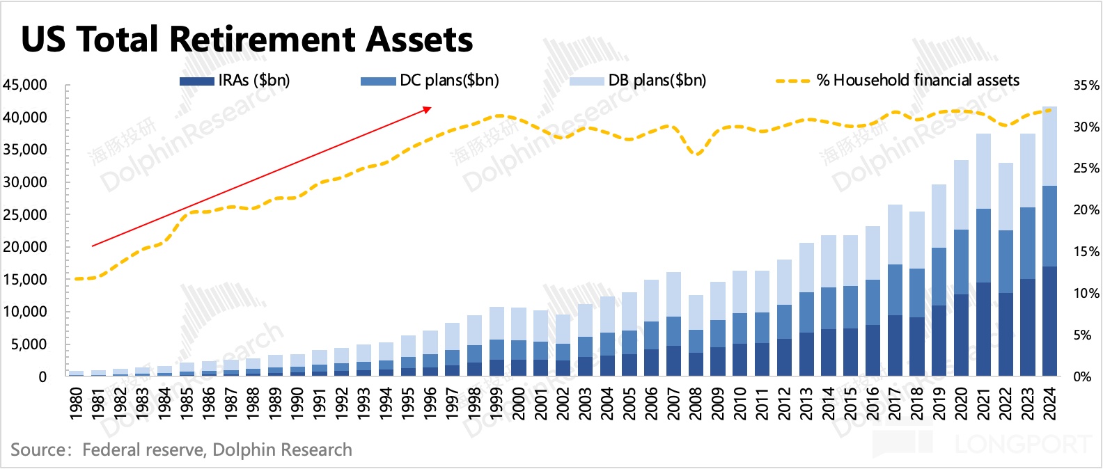 而同期的婴儿潮群体也已经迈入20-40岁,工作过一段时间也开始有了一些积蓄。而组建家庭后持续增长的消费需求,也使得该群体对财富增值有更强的主动意愿。与此同时,1974年美国个人退休账户(IRA)推出、1982年使用范围扩大,和后来推出的401(K)企业员工退休账户(属于下图中的DC Plans),这部分主要退休后才能取现使用的资金,进一步了激发普通大众的长期理财意识。1990年末,养老金逐步成为家庭金融资产中占比30%的重要组成部分。