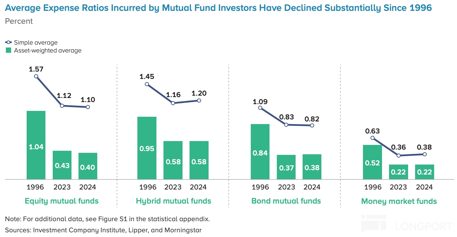 龙头们开打价格战,自然会带动整个行业的降费趋势得以加速。2010年末,共同基金的平均总费率不足1%,相比20年前的价格直接腰斩。
