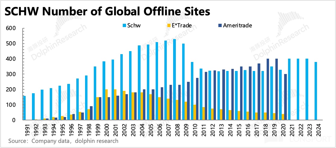 在创立的前5年里,逐步开了18个网点机构,随后加速完善线下网络。截至今天,嘉信一共有380个分支机构遍布全球。而1990年初,嘉信当时的最强竞对——互联网券商往往对线下网点天然不够重视。但在用户适应技术更替、熊市蔓延的关键窗口期,线下网络能够给到用户更多的服务和品牌信任。直到1990年末,E*Trade、Ameritrade两家才加快铺设线下网点。
