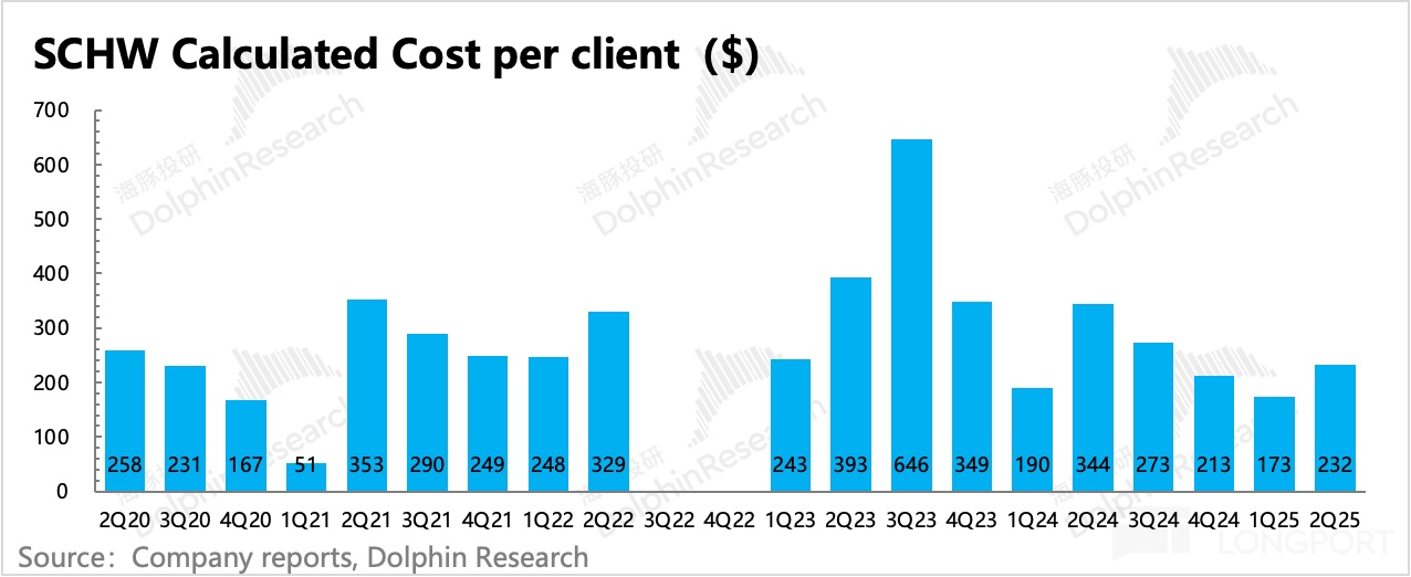 也正是“财富管理”的标签逐渐深入人心,嘉信已经跟随核心用户的财富积累,通过不断丰富相应的产品服务,无需太多额外的推销,即可自然向更广泛和更富裕的阶层渗透。近几年,嘉信的获客成本相对稳定,用300美元拉来的是一个净新增用户平均20万美元入金。Q2业绩电话会上,管理层提供了目前高净值客户的渗透率情况:“美国每6个资产超2000万美元的高净值家庭中,就有1个家庭选择了嘉信。”