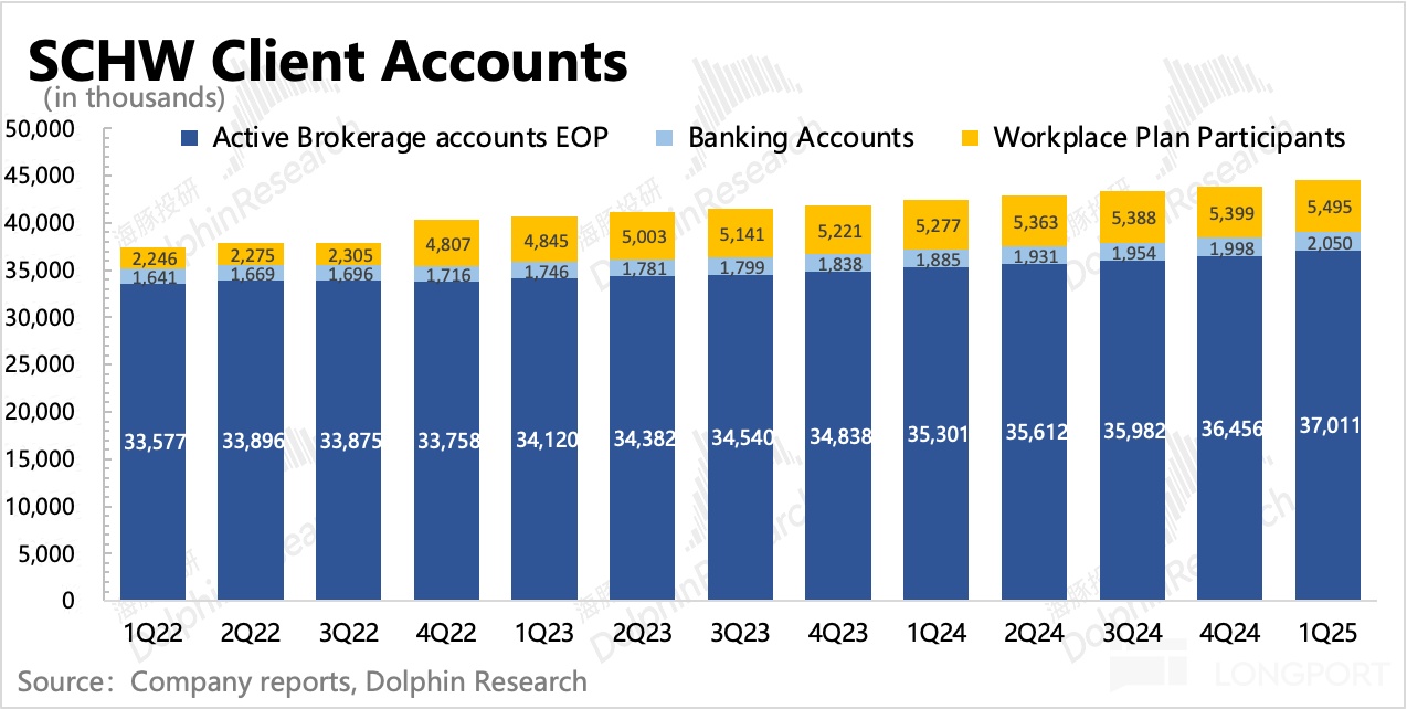 (1)老牌财富管理竞对Fidelity、Vanguard同样非常高,总账户都达到了7000万以上,主要是拥有非常多的企业客户(401K退休计划)和机构账户,但他们的个人投资账户数则和嘉信一样在3000万的量级(如Fidelity 2024年末拥有3920万个零售经纪账户)。
