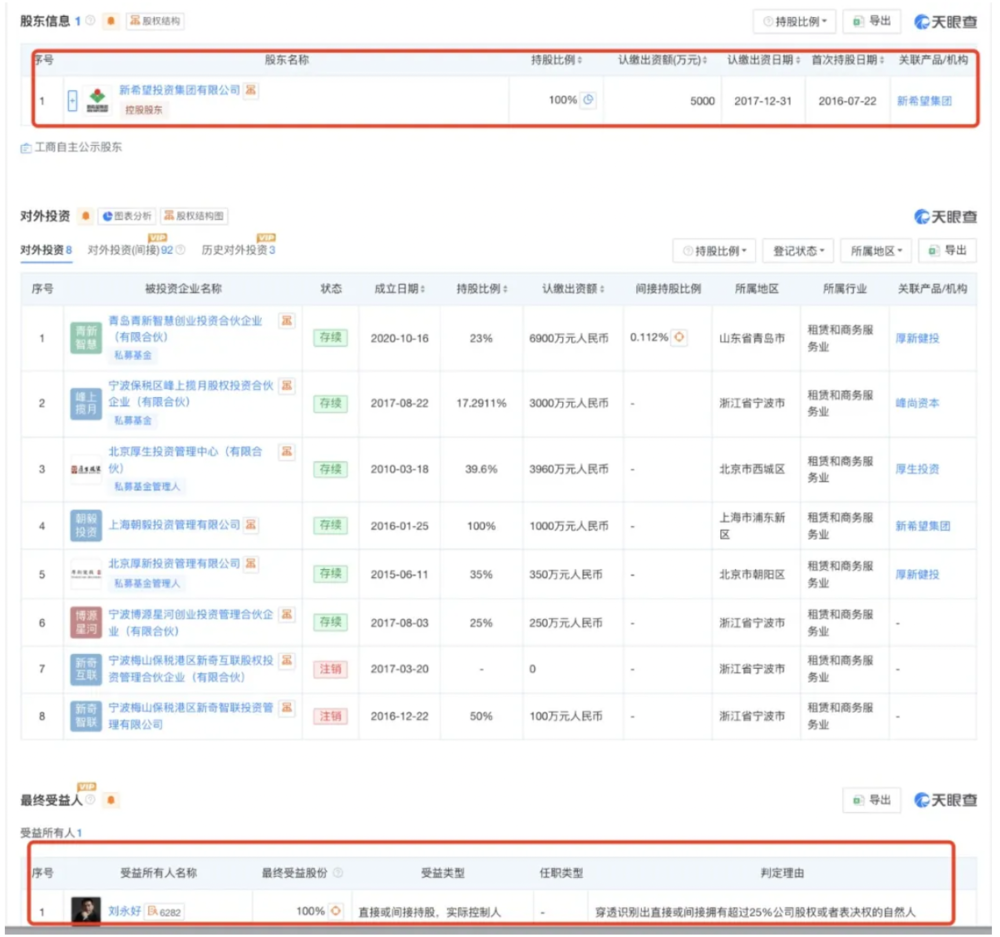 天眼查数据显示,北京厚生投资管理中心的合伙人包括拉萨经济技术开发区新地实业有限公司,后者出资39.6%,为新希望投资集团有限公司的全资子公司。