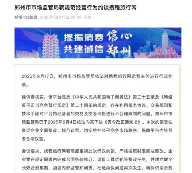 9月17日,郑州市市场监管局的一则公告,将行业巨头携程推至风口浪尖。公告称,已依法对携程运营主体进行行政约谈,直指其涉嫌利用服务协议、交易规则及技术手段,对平台内经营者的交易与价格施以不合理限制。