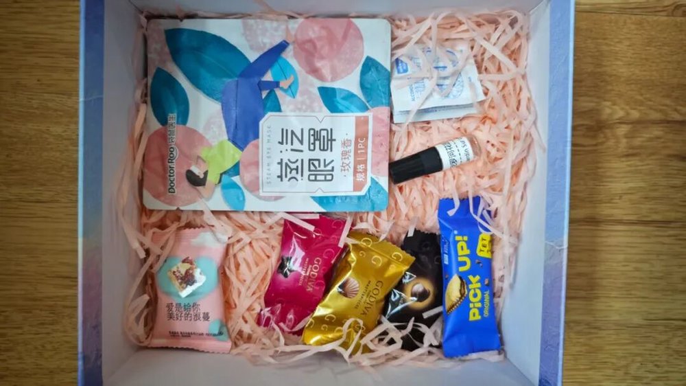 最后一层是四五颗巧克力,一瓶香水试样,还有一个蒸汽眼罩。