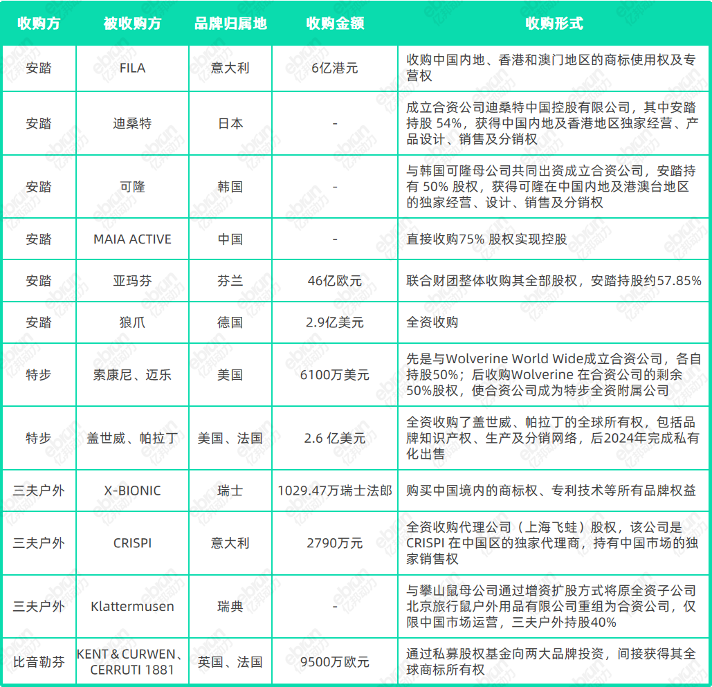 一是全资收购,即获取品牌完整控制权,如安踏2025年以2.9亿美元收购狼爪,特步2023年全资收购索康尼;