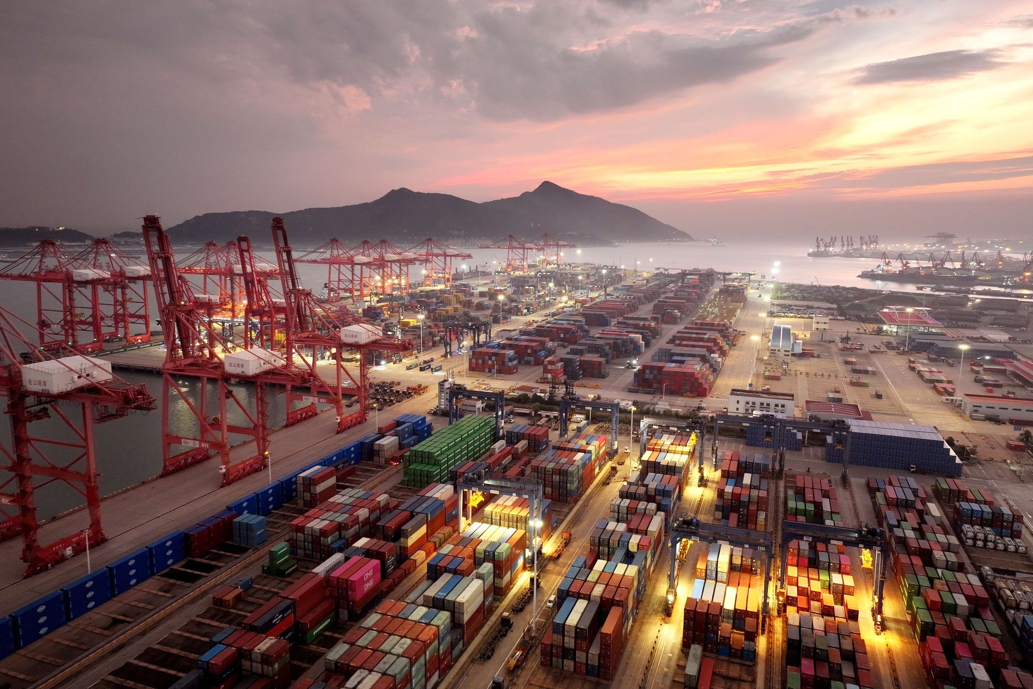 俯瞰江苏连云港码头等待出口的外贸集装箱。9月15日,中国国家统计局公布数据显示2025年1至8月货物进出口总额达到29.57万亿元,同比增长3.5%,其中出口增长6.9%至17.61万亿元,进口下跌-1.2%至11.96万亿元。中国对东盟进出口同比增长9.7%,对欧盟进出口增长4.3%,对美国进出口下跌-13.5%。摄影师:iDaily Media