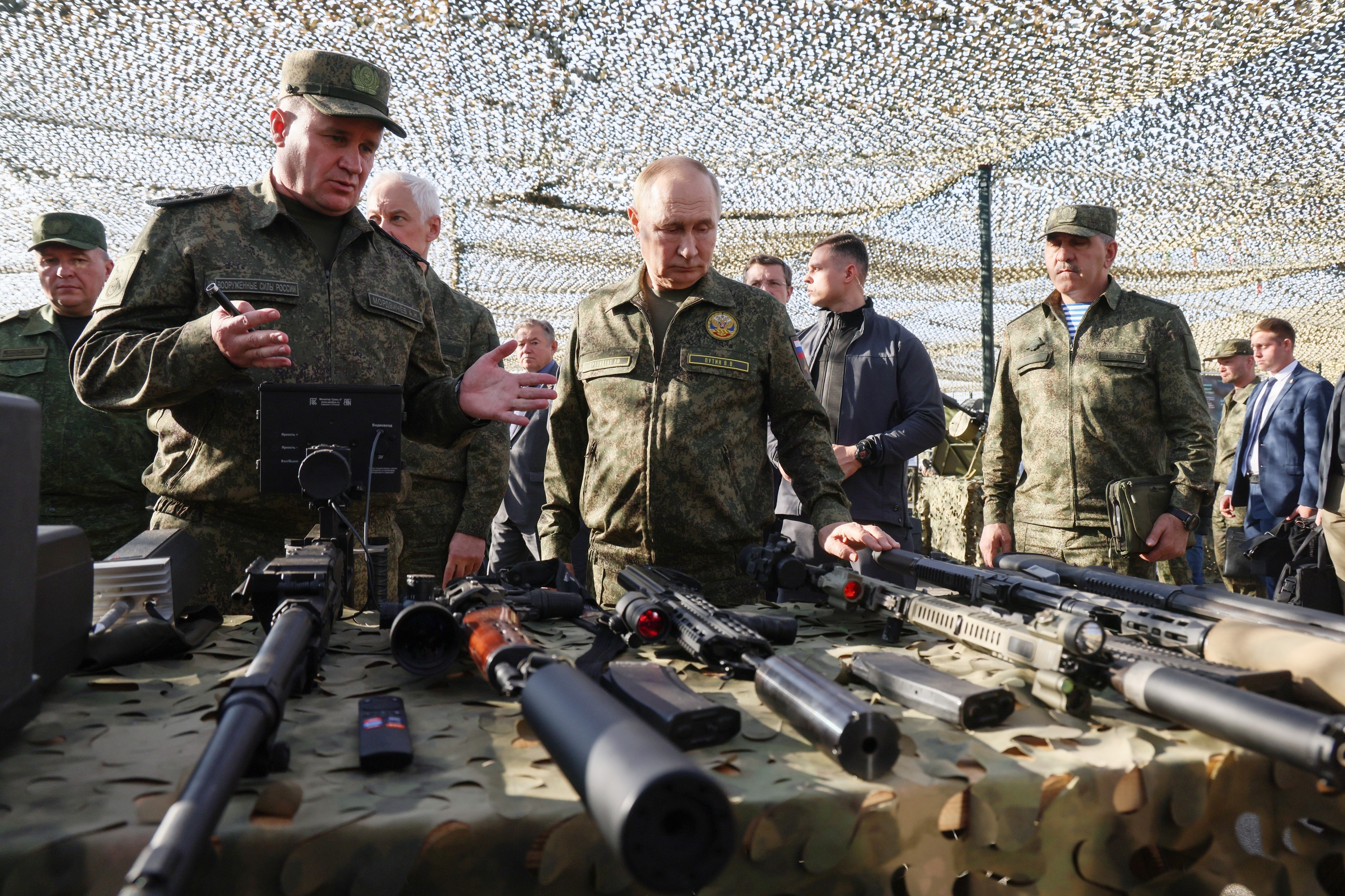 俄罗斯总统 Vladimir Putin 视察俄白「西方-2025」联合战略演习,下诺夫哥罗德州。9月16日,俄罗斯与白俄罗斯军队联合开展的「西方-2025」战略演习正式闭幕,本次演习共持续5天,两国出动约10万士兵、1万套武器装备、超过300架战机和逾200艘舰艇参加,预设模拟背景为白俄遭入侵后进行反击。印度、伊朗、孟加拉国、布基纳法索、刚果和马里6国派出军事特遣队参加本次演习,美军首次派出代表以观察员身份参与观摩。摄影师:Mikhail Metzel