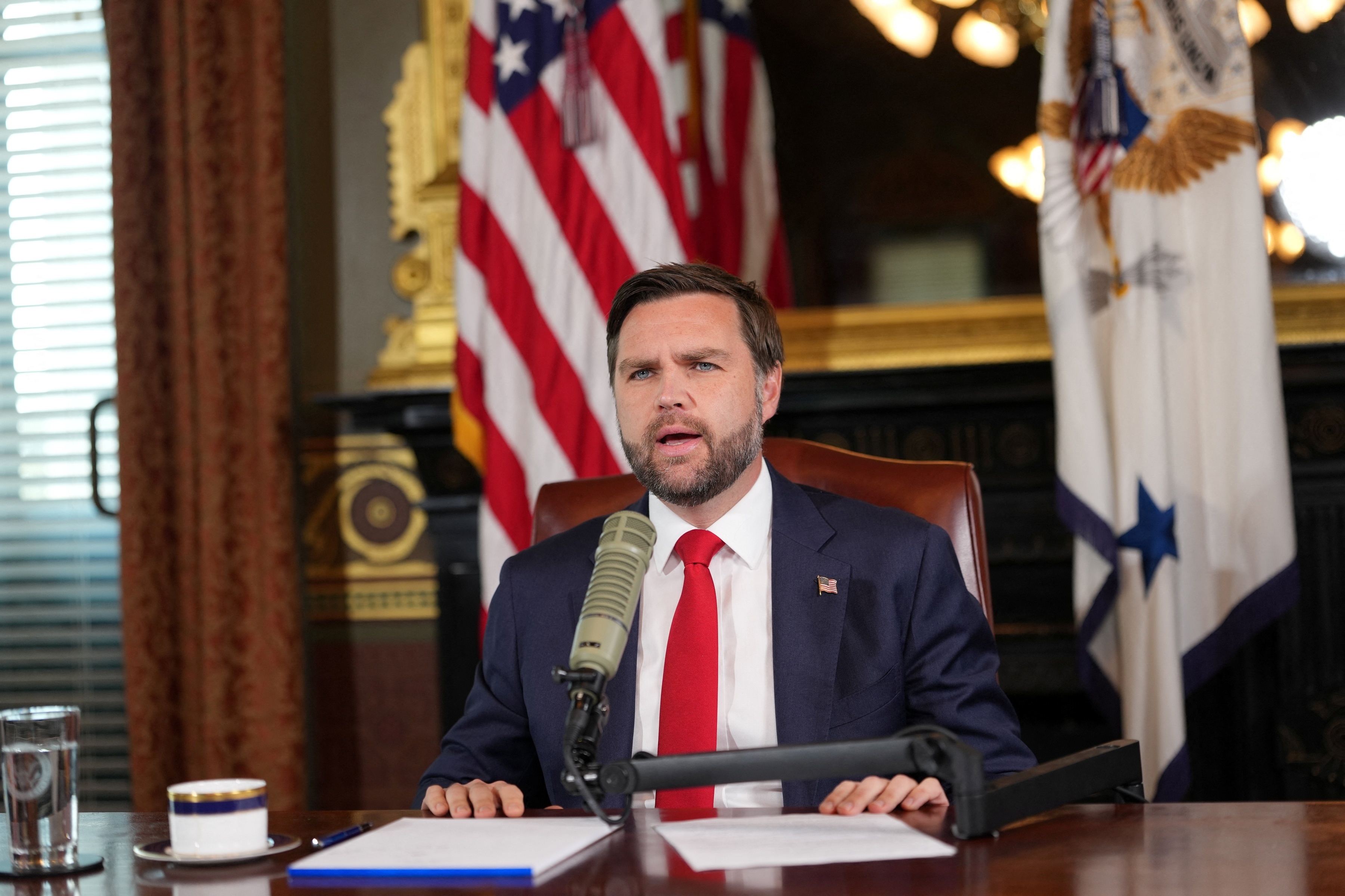 美国副总统 JD Vance 在白宫录制《查理·柯克秀》特别节目,华盛顿特区。9月15日,美国副总统 Vance 代班主持保守派政治活动家 Charlie Kirk 的同名播客节目以悼念其遭刺杀身亡。Vance 在节目中指控美国左翼团体应为本次刺杀事件负主要责任,并宣称将摧毁美国「庞大的国内恐怖主义网络」。31岁的 Kirk 于9月10日在犹他州山谷大学演讲时遭枪击身亡,FBI 调查结果显示嫌犯为一名来自共和党保守派家庭的22岁年轻白人男性 Tyler Robinson,目前作案动机尚未查明。摄影师:Doug Mills