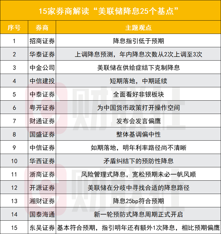 截至发稿,已有超过15家券商研究所发布相关研报,“符合预期”成为主流判断,而“10月、12月议息会议有望各降息25个基点”获得多数认同。