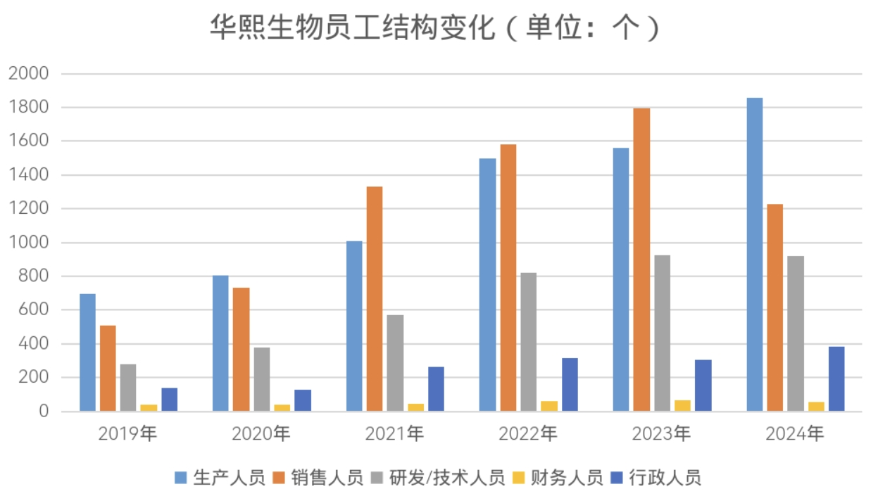 截至2024年,华熙生物年报显示公司在职员工总数为4444人,同比减少211人,降幅达4.53%。人员结构变动中,销售团队缩减最为显著,人数同比下降31.78%,共减少571人;财务人员减少14人,降幅为20.59%,研发与技术人员也略有调整。