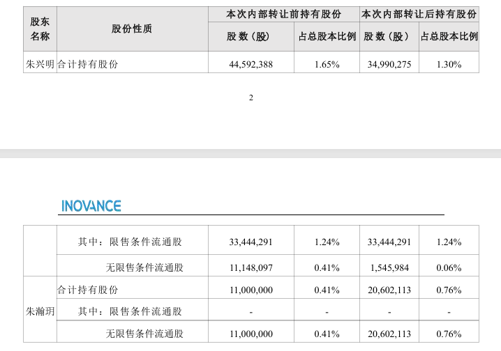 2021年,朱兴明与女儿朱瀚玥签署《赠与协议》,将其直接持有的汇川技术股票20602113股(占公司总股本比例0.76%),以及深圳市汇川投资有限公司(下称“汇川投资”)21.7029%股权的全部财产权益,无偿赠与给朱瀚玥。完成赠与后双方为一致行动人。