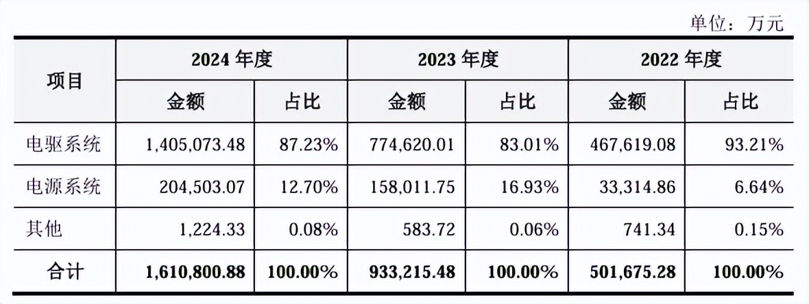从具体业务来看,电驱系统产品成为联合动力的主力营收来源。2022年至2024年,电驱系统业务实现营收占总收入比例为93.21%、83.01%、87.23%。