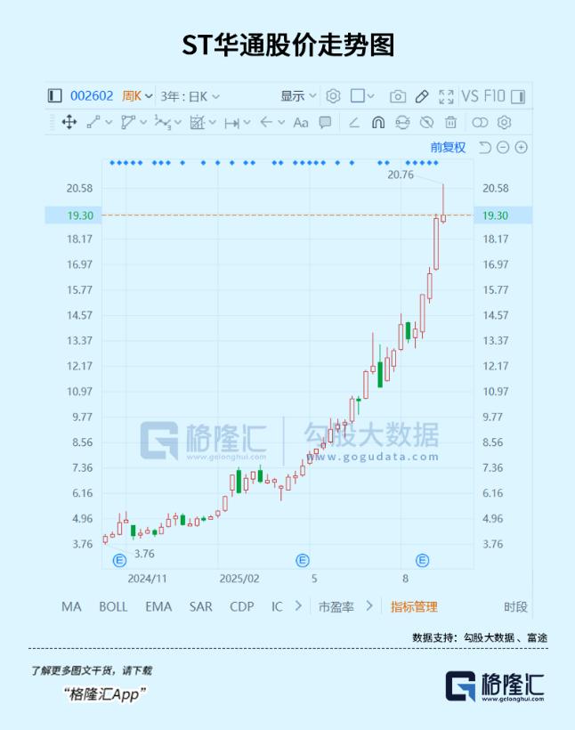 若是从去年年中最低的2.99元/股算起,一年时间里,ST华通已上涨6倍。