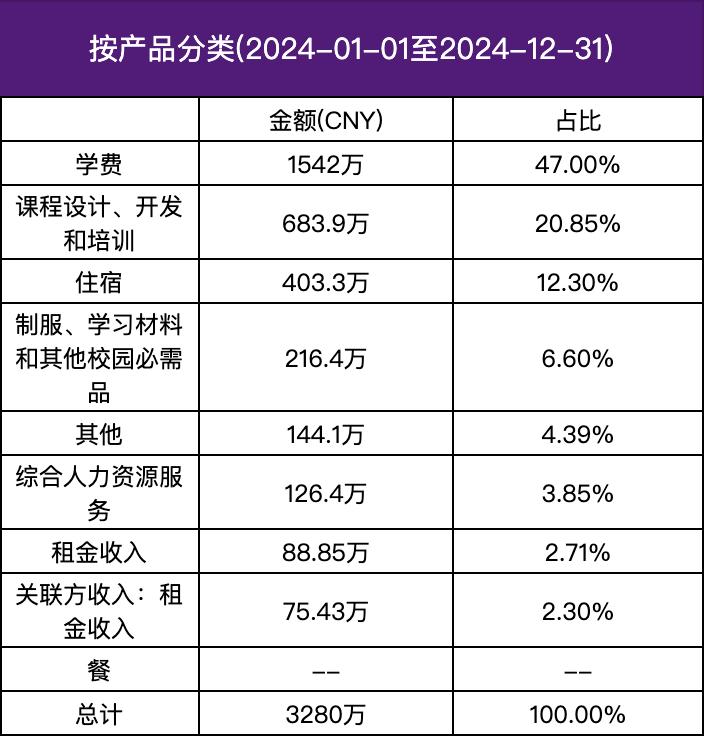 从业务构成看,2024 年丽翔的收入合计 3280 万元,其中学费 1542 万元占 47%,其余近一半来自校内配套与服务:课程设计/开发和培训 683.9 万元(20.85%)、住宿 403.3 万元(12.30%)、校服与学习材料等 216.4 万元(6.60%),以及人力资源服务、租金与关联方收入等零散科目合计约 13%。也就是说,学校主业之外的配套收入比重不低,但体量总体有限,难以形成规模效应。