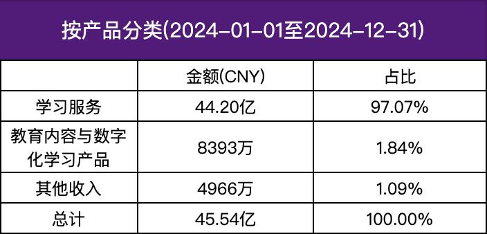 从业务结构看,2024 年高途仍是教育服务型公司。全年 45.54 亿元收入中,学习服务贡献 44.20 亿元,占比 97.07%;「教育内容与数字化学习产品」为 0.84 亿元,占比 1.84%;其他收入 0.50 亿元,占比 1.09%。这意味着公司的主要收入仍来自课程与教学环节,产品化与工具化收入处于补充地位。