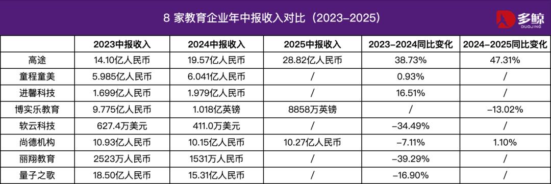 以中报数据为锚点,对照 2023—2025 年(按公司披露口径)观察八家企业在收入与净利润上的变化,以期呈现「双减」之后的真实进展与分化方向。