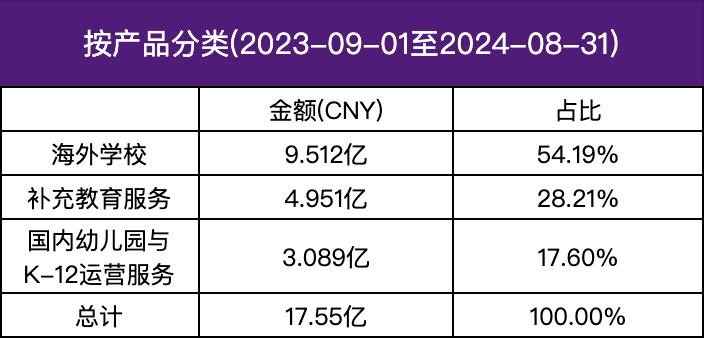 从业务构成看,博实乐的重心已经明确落在海外学校。2024财年营业收入 17.55 亿元,其中海外学校 9.512 亿元,占比 54.19%;补充教育服务(课后与延伸课程等) 4.951 亿元,占比 28.21%;国内幼儿园与 K-12 运营服务 3.089 亿元,占比 17.60%。