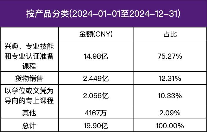 从业务结构看,2024 年尚德仍是成人与终身学习的典型样本。全年营收 19.90 亿元中,兴趣、专业技能和专业认证准备课程贡献 14.98 亿元(75.27%),以学历或文凭为导向的专上课程 2.06 亿元(10.33%);同时保留一定规模的货物销售(教材/设备等) 2.45 亿元(12.31%)。这解释了第一部分里「收入更趋稳定」的结论,因为以职业技能与认证为核心的收入结构带来了可预期的续班与复购,让规模不再依赖高强度投放而大幅波动。