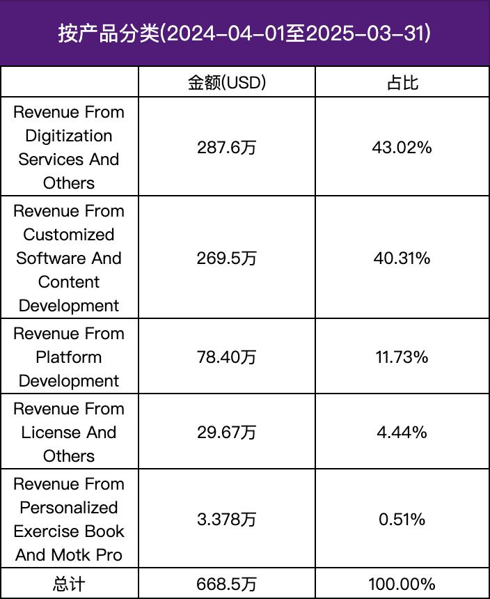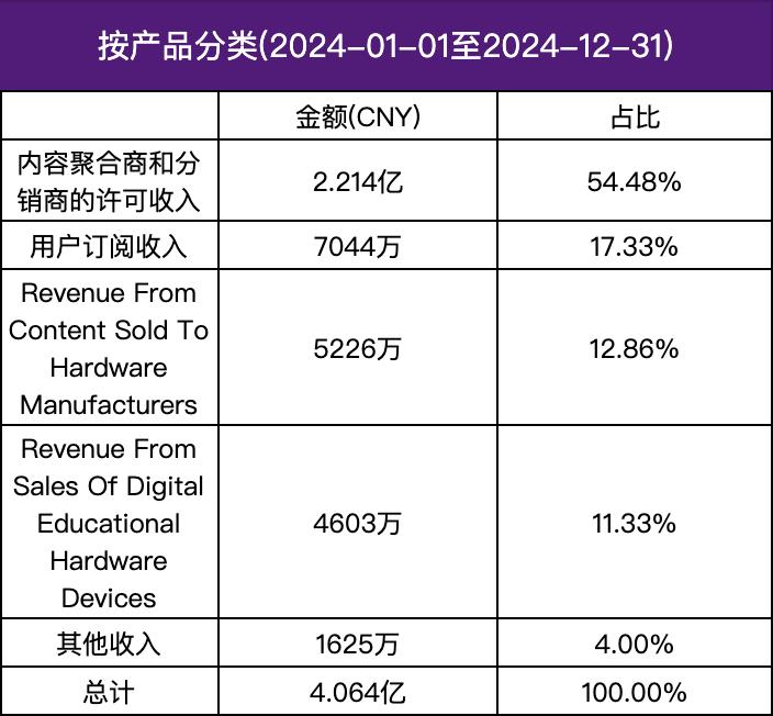 从2024年全年数据来看,进馨科技的收入主要由许可与订阅两大板块构成其稳定底座。其中,来自内容聚合商和分销商的许可收入为2.214亿元,占总收入的54.48%;来自终端用户的订阅收入为7044万元,占比17.33%。其余收入则来源于波动性较大的硬件相关业务:包括向硬件厂商授权内容获得的5226万元(占12.86%),直接销售数字化教育硬件获得的4603万元(占11.33%),以及其他收入1625万元(占4.00%)。