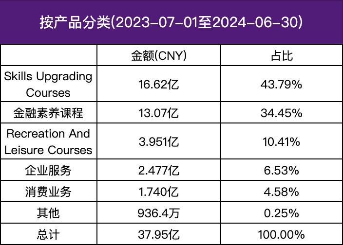 从业务构成看,量子之歌以技能升级课程和金融素养课程为双主轴。在 2024财年里,营收合计 37.95 亿元,其中技能升级 16.62 亿元(43.79%)、金融素养 13.07 亿元(34.45%),二者合计占 78%;其余为休闲与兴趣课程 3.95 亿元(10.41%),企业服务 2.48 亿元(6.53%)与消费业务 1.74 亿元(4.58%)。这套结构说明收入主要来自标准化的成人课程,B 端与其他业务仍是补充。