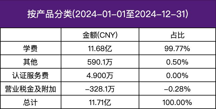 从业务结构看,2024 年童程童美几乎完全依赖学费变现。全年营业收入 11.71 亿元,其中学费 11.68 亿元,占比 99.77%;「其他」与「认证服务费」合计不足 1%。这意味着公司仍以线下/线上课程服务为主体,围绕教材、认证或工具化产品形成的附加收入占比很小,收入弹性主要取决于招生与续班。