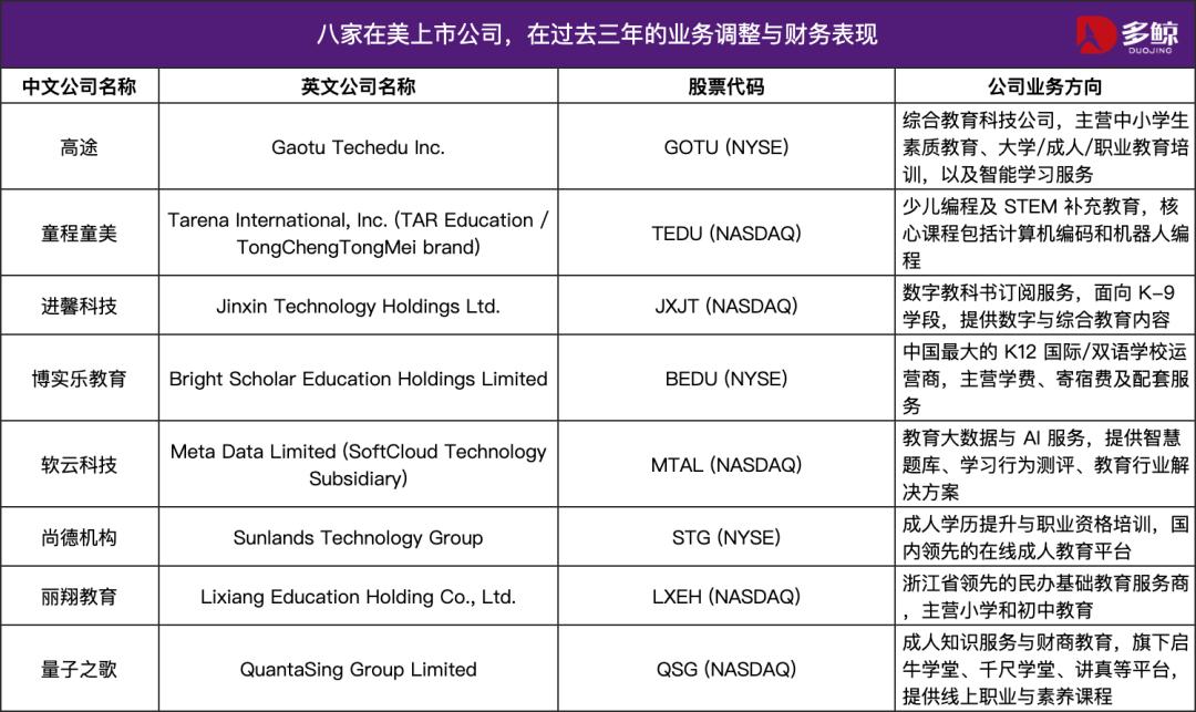2025 年上半年,教育行业在重塑与探索中步入新的阶段。政策调整的影响已逐渐被市场消化,需求结构趋于稳定,企业的生存与发展逻辑也经历了根本性的转变。与早期以学科类培训为主的模式不同,如今市场的焦点转向了素质教育、成人与终身学习、教育信息化以及校内教育等细分赛道。在上篇(转型的十字路口:8 家教育中概股的版图重构)中,文章聚焦于八家在美国上市的中国教育中概股,呈现它们从 2021–2022 的财务分化到 2023–2025 的战略重构,全景展现行业分化格局的形成过程。下篇,文章将分析高途、童程童美、进馨科技、博实乐教育、软云科技、尚德机构、丽翔教育、量子之歌这八家在美上市公司,在过去三年的业务调整与财务表现中,呈现出的不同轨迹,共同映射出的行业转型期的挑战与机遇。