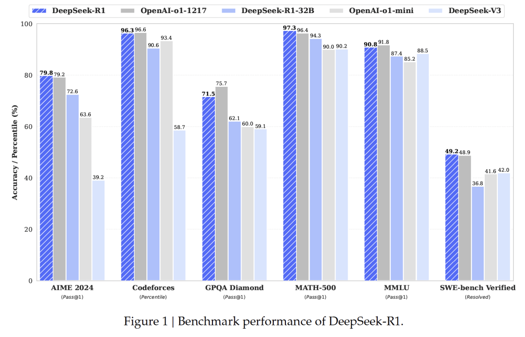 实验表明,DeepSeek-R1与当时的顶尖模型OpenAI-o1-1217不相上下。
