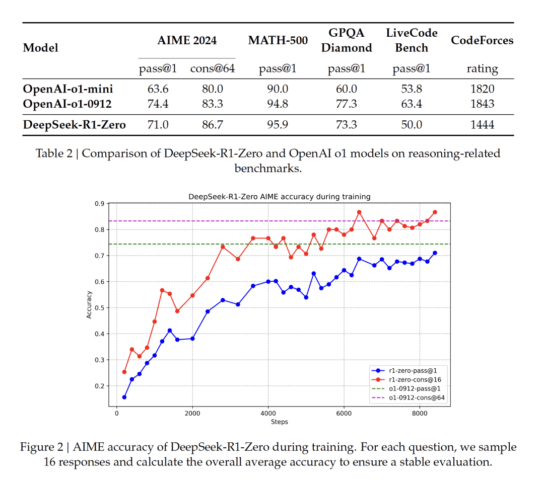 经过数千步强化学习训练后,DeepSeek-R1-Zero 在推理基准测试上表现出卓越性能。