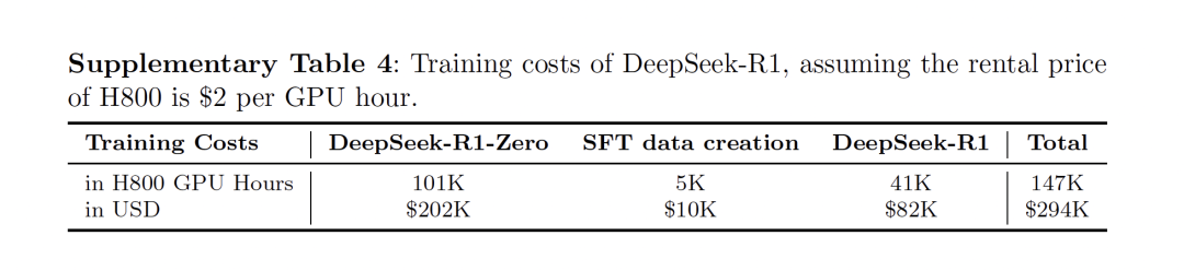 在训练花费方面, R1-Zero和R1都使用了512张H800GPU,分别训练了198个小时和80个小时,以H800每GPU小时2美元的租赁价格换算的话,R1的总训练成本为29.4万美元。