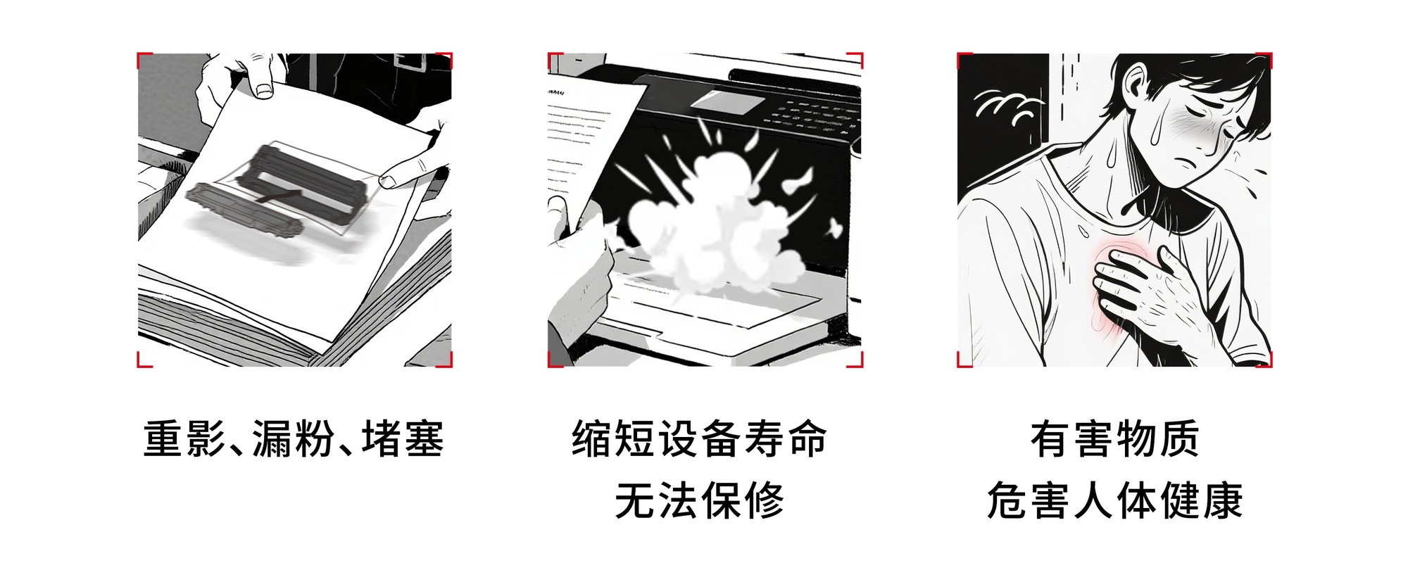 ⚠️ **假冒耗材的潜在风险不容忽视**:企业常因追求低价而选择非原装耗材,但这可能导致频繁的打印故障(如重影、漏粉、堵塞),严重影响工作效率和文档质量。同时,假耗材会对打印机核心部件造成损害,加速设备老化,且此类故障通常不在原厂保修范围内。更严重的是,部分假冒耗材含有害化学物质,长期接触会危害员工健康,带来潜在的健康风险。
