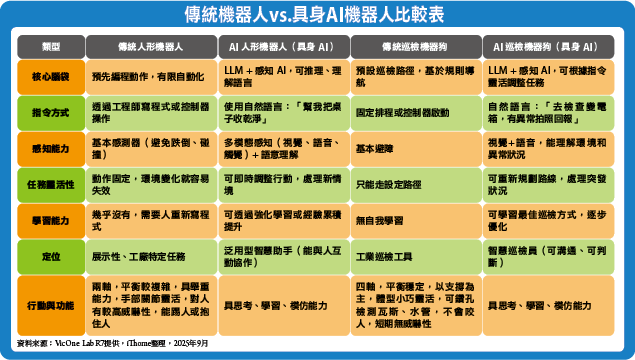 傳統機器人就像是機械動作的「工具」,腦袋是「寫死的程式」;具身AI機器人,則是會聽懂、會判斷、能學習的「智慧助手」,腦袋是「能理解語言、推理、學習的AI。
