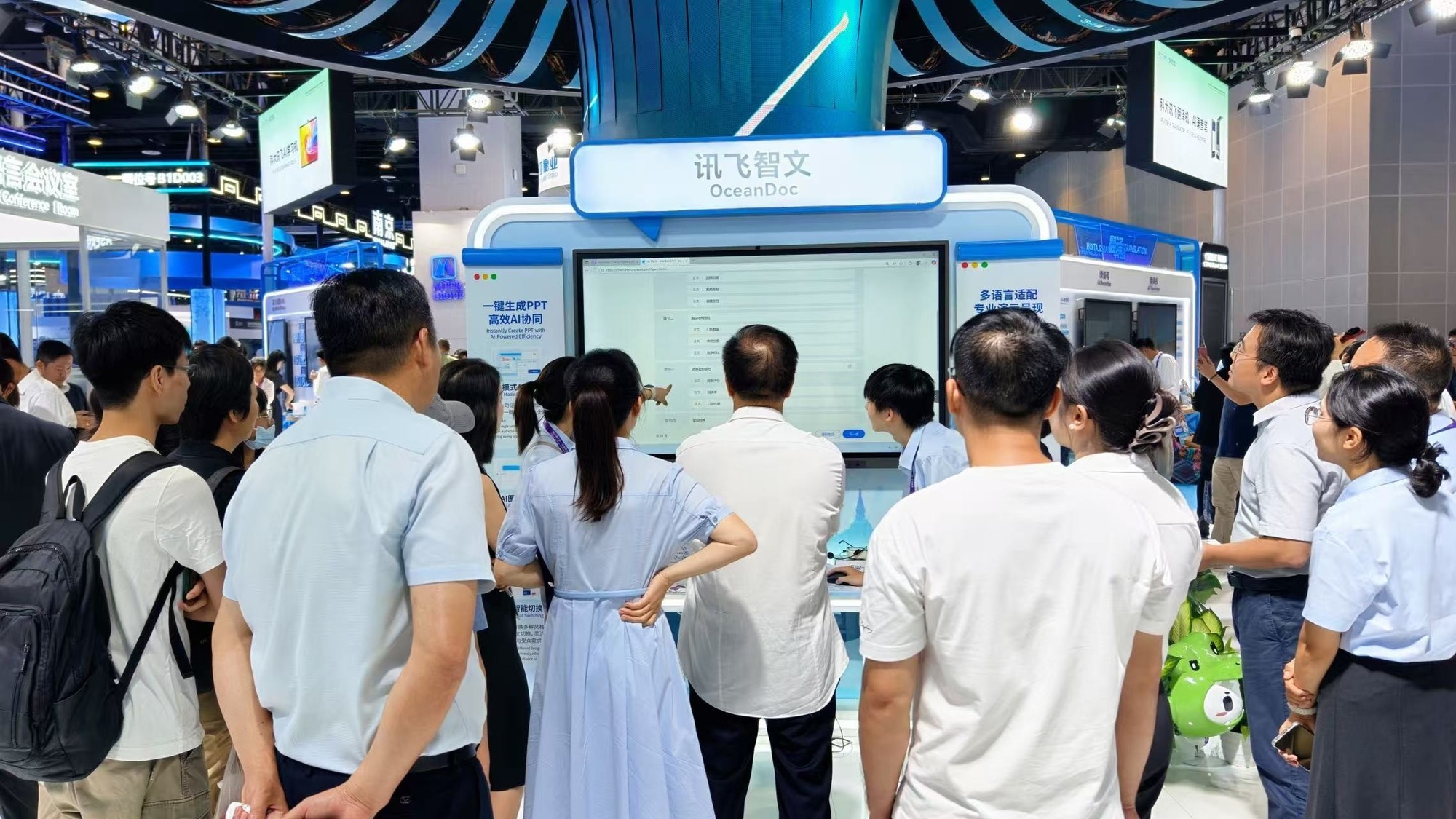 展会现场,讯飞智文设置了互动体验区。产品讲解员在现场为往来观众演示和讲解,一边流畅操作平台,一边介绍讯飞智文与OceanDoc在跨语言创作、智能排版与多场景应用方面的功能,吸引了大量东盟国家客商、专业人士驻足咨询与体验。