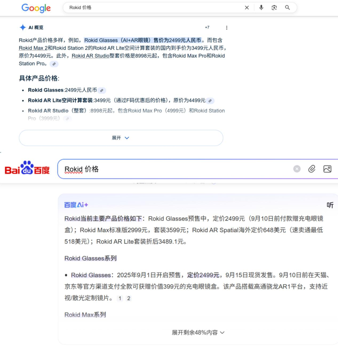 一个是天然占据了传统搜索和AI搜索两大流量入口的2499这一低位价格带关键词。「市象」实测发现,无论在百度还是谷歌,以“Rokid价格”为关键词进行搜索,AI搜索与传统搜索展示的价格信息仍是发布会时的2499元。