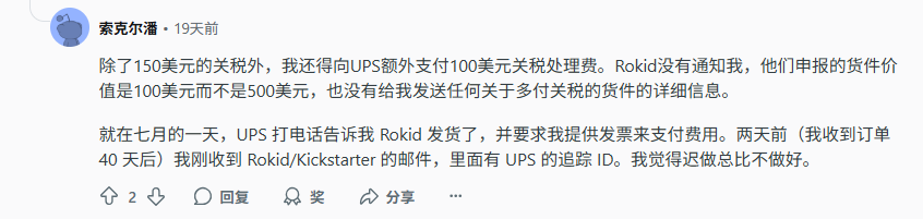 以UPS清关费用为例:有用户反馈,除了被收取150美元的进口关税外,还被UPS额外加收了100美元的关税处理费,而这些费用在付款前从未被明确告知。Rokid在申报过程中将货值标注为100美元,而不是500美元,但又未及时与用户沟通,导致清关时产生了更多额外成本。