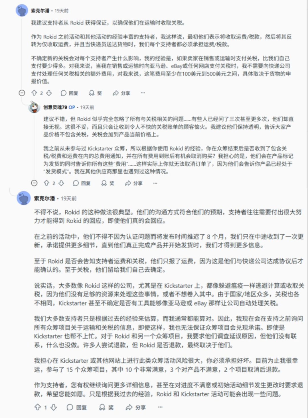 从社区讨论来看,一些参与海外众筹的早期支持者都遭遇了这波品牌信任打击。这种问题在Kickstarter并不少见,但正如一位老用户所言:“Rokid现在的体量和节奏,已经不像是典型的早期项目了,仍然延续低沟通密度的处理方式,只会持续透支信任。”