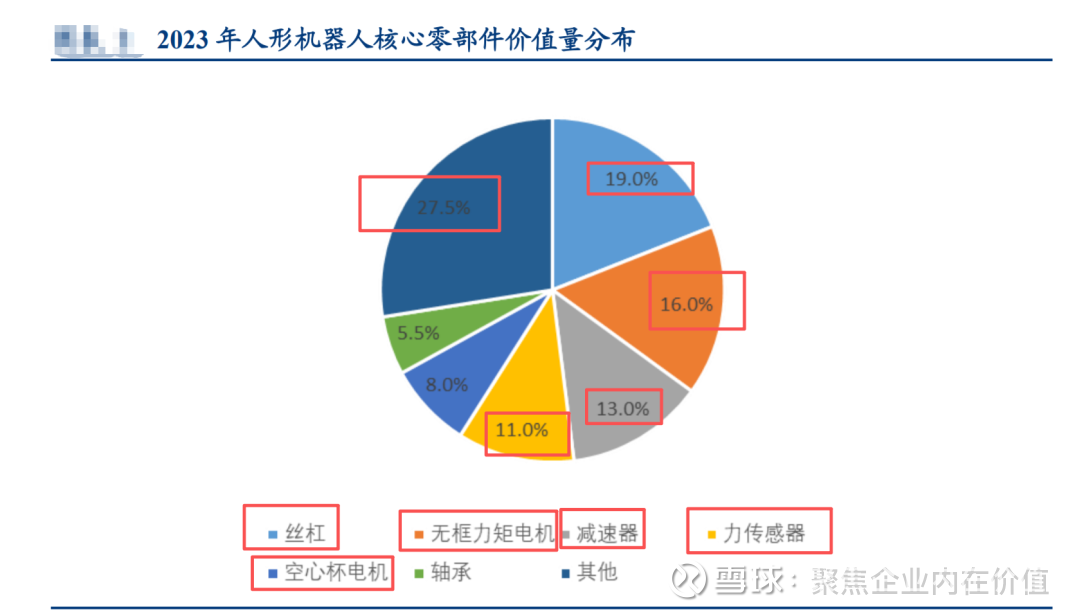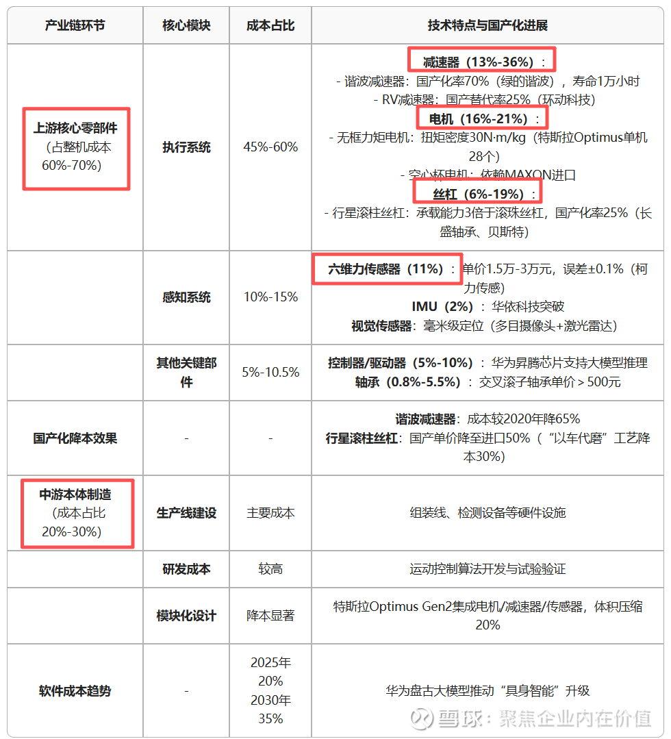 高价值部件:谐波减速器、行星滚柱丝杠、无框力矩电机、六维力传感器占成本70%以上。