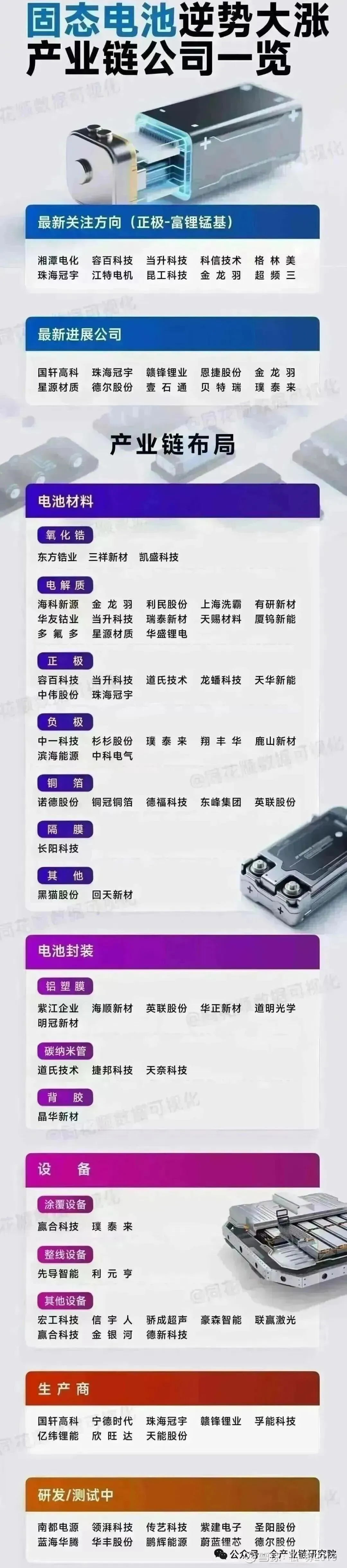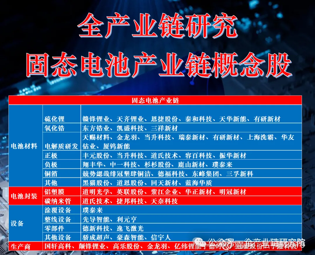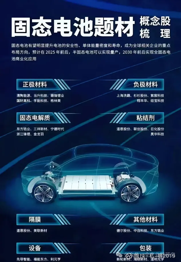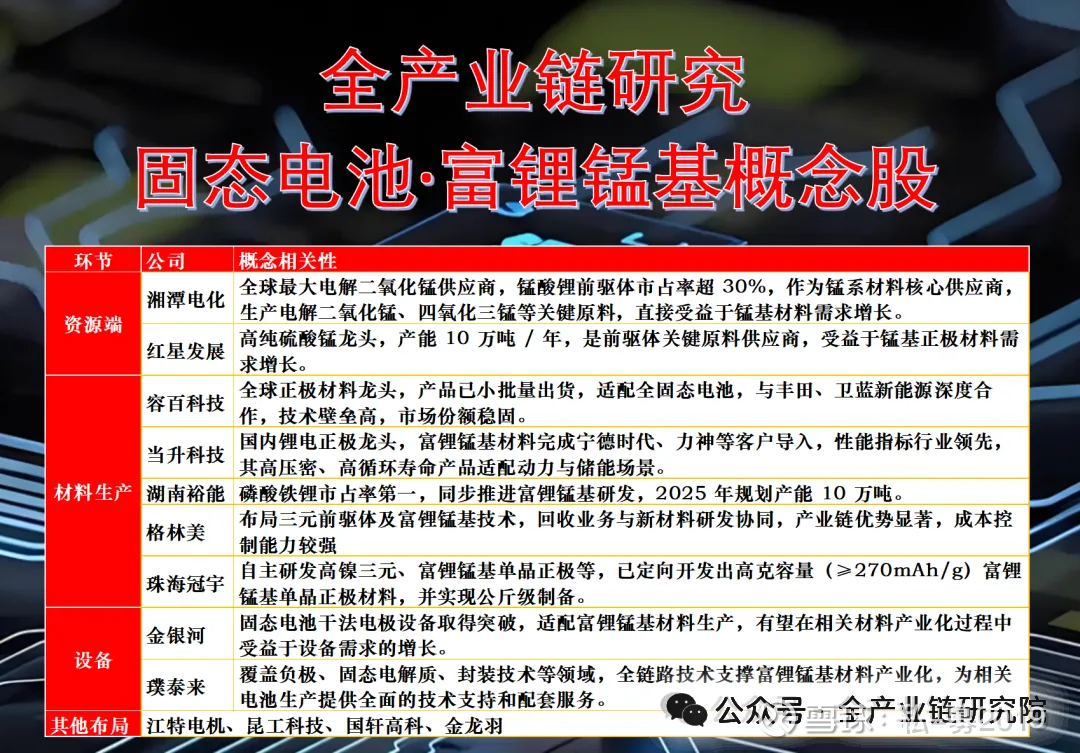 设备与材料龙头企业: 固态电池产业链核心公司涵盖设备与材料领域龙头。设备方面,绑定头部客户的设备龙头有先导智能和利元亨,先导智能是固态及传统液态电池龙头,布局等静压及干法设备并出货到国内外头部定制厂;利元亨也布局等静压及干法设备,市值弹性较大。干法工艺企业有青研电子系(干法纤维化工艺领军企业)、纳克诺尔和宏工科技。激光设备领域,联赢激光传统份额大,虽固态创新激光未落地,但预计受益于固态电池激光用量增加;德龙激光获宁德固态激光设备订单,属固态增量环节。ALD设备方面,微导纳米与先导智能在固态电池验证上更具优势,以光伏为主切入半导体,ALD设备份额占比高,技术储备和经验好,看好其在固态电池领域导入。涂布环节的曼恩斯特,因固态或干法工艺对涂布要求提升而受益,且已布局干法或固态产线交付。材料企业中,博彦股份的碘化碘化物用于电解质表面改性或处理,正在电解质厂商中导入;英联股份专注锂金属复合集流体。