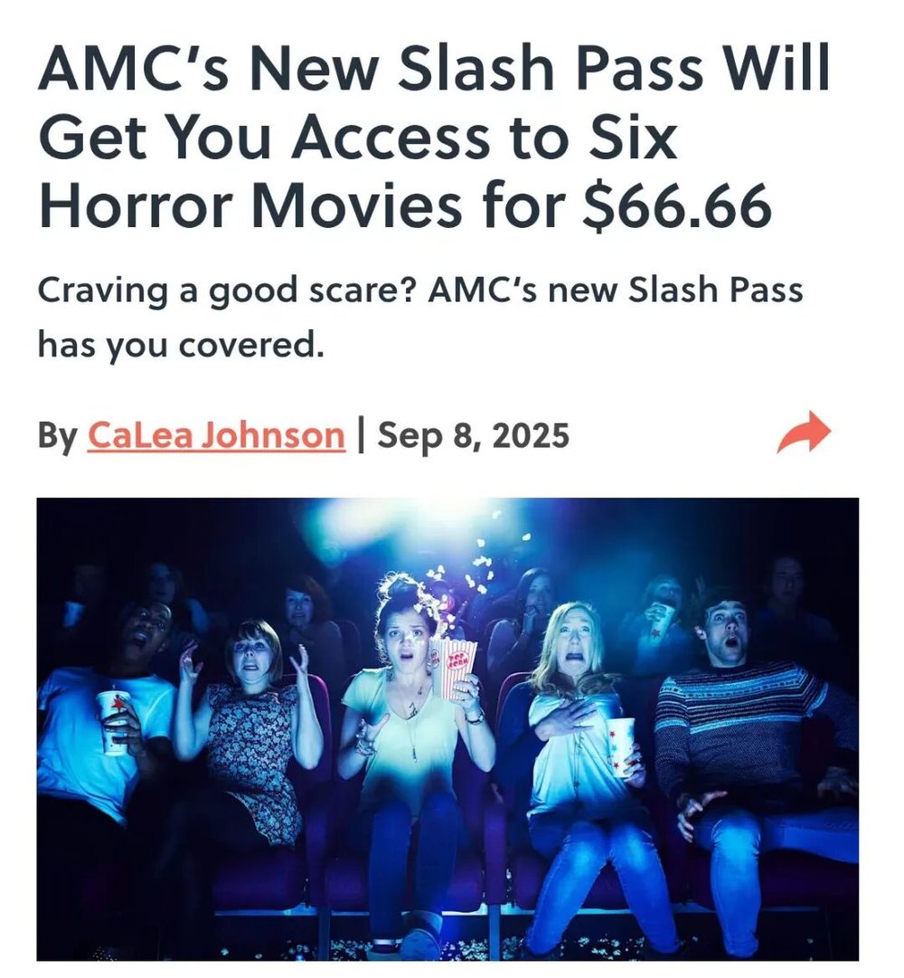 于是,在这股风潮下,影院想尽办法留住年轻观众。美国最大院线AMC最先嗅到商机,推出新策略“AMC Slash Pass”来应对暑期档之后的淡季疲劳,即66.66美元就可以在年底之前观看六张恐怖片,或者邀请其它五位朋友看一部恐怖片。
