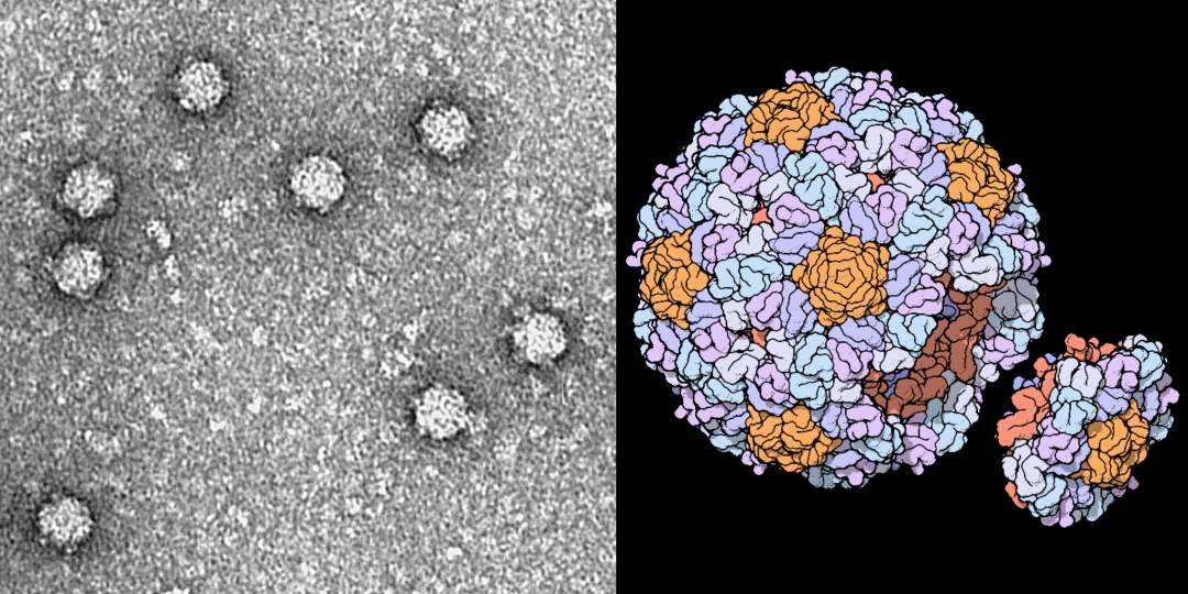 左:ΦX174噬菌体显微照;右:单个ΦX174噬菌体3D结构