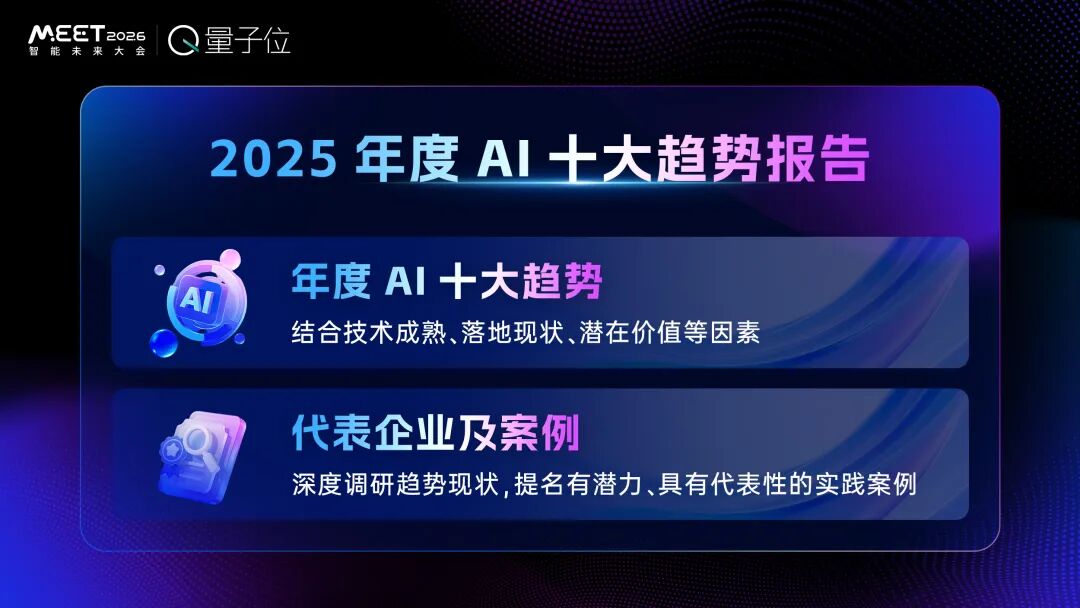 本次评选从即日起开始报名,截至2025年11月17日。评选结果将于量子位主办的MEET2026智能未来大会上正式公布。
