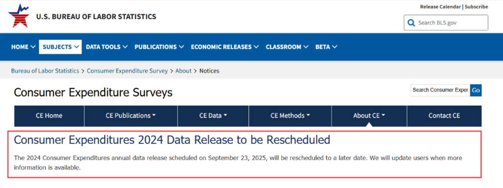 (美国劳工统计局官网显示年度消费者支出数据发布时间将被推迟)