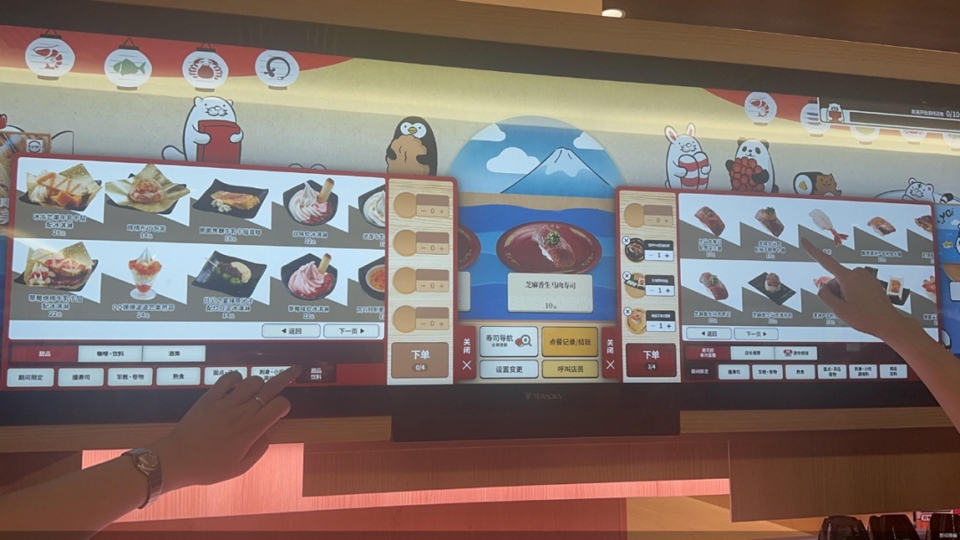 从体验感看,这两家回转寿司没再走过去普通传送带、一道菜传遍所有人的老路。消费者通过平板电脑或者超大屏幕,在琳琅满目的上百种产品中选好菜下单,后厨会即点即做,再用专门的传送带,把菜刚刚好好送到他们的面前,并配上一段提醒菜已送达的BGM,仪式感直接拉满。