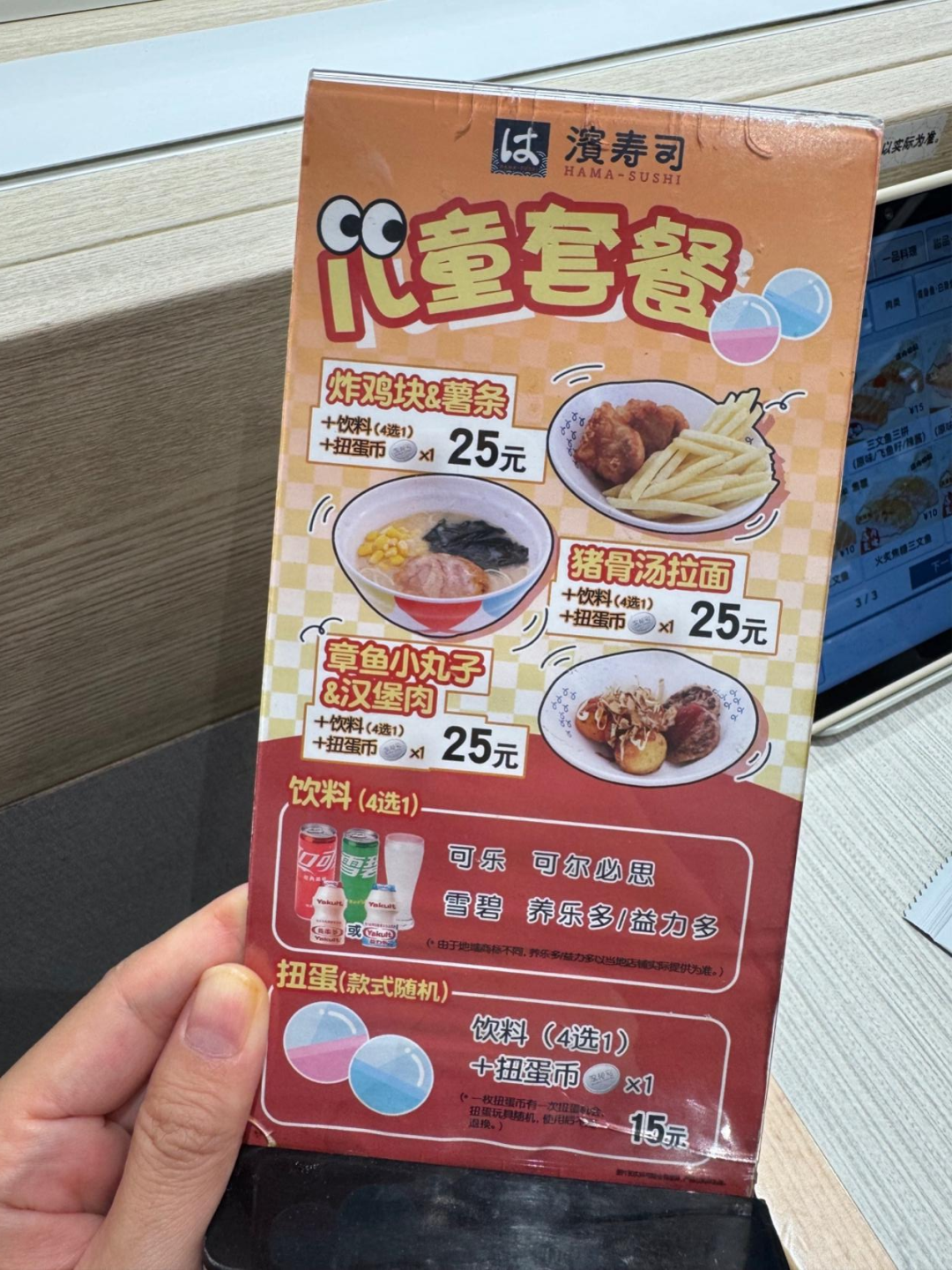 相比上一代连锁日料,寿司郎和滨寿司在服务家庭人群上还搞了新花样。比如它们都强调食材新鲜和门店现做,解决了家庭客最关注的安全牌问题,寿司郎的消费者也已经自行在社交网络上总结了「非生食菜单」,来满足肠胃较弱的孩子、老人和孕妇的需求。而滨寿司则有自己的儿童套餐,一份兼顾碳水和蛋白质、并配了饮料的套餐只要25元,还会附赠一枚「扭蛋币」,让小孩子或者kidult能在扭蛋机前开心一下,就餐也就有了迪士尼的娱乐感。