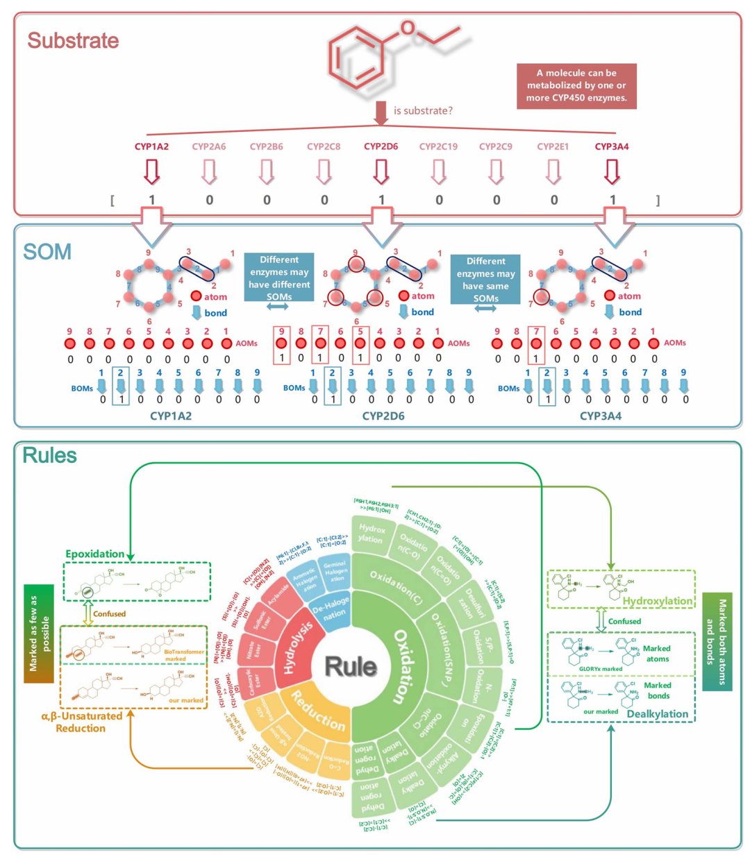 图1. 底物与代谢位点(SOM)数据集整理及代谢反应规则汇编工作流程。系统展示了底物数据集、SOM 数据集的构建流程,以及代谢反应规则的分类体系。在底物处理部分,图示了不同 CYP450 亚型对底物的代谢情况,并将每种分子的代谢酶信息编码为二进制向量;SOM 标注环节则通过原子级(AOM)与键级(BOM)双重标注,区分不同反应类型的代谢位点(如用 AOM 标注羟基化反应,用 BOM 标注脱烷基化反应),解决传统标注的歧义问题。反应规则部分以饼图呈现了四大类反应(氧化、还原、水解、脱卤)的分类及占比,且规则数量较现有工具 BioTransformer3.0 增加约 25%,整体流程确保了数据集的完整性与规则的机制一致性。