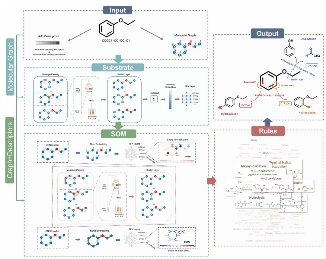 图3. DeepMetab 工作流程。完整呈现了 DeepMetab 从输入到输出的全流程:输入模块将分子 SMILES 格式转换为包含多尺度特征的分子图;底物模块通过图神经网络(GNN)预测分子可被哪些 CYP450 亚型代谢;SOM 模块基于底物模块的预测结果,调用对应亚型的模型,通过 AOM 与 BOM 双模型定位具体代谢位点;规则模块匹配预构建的代谢反应规则库,根据代谢位点生成相应代谢产物;输出模块整合所有结果,系统输出预测的代谢酶、代谢位点、代谢产物及评分指标,形成端到端的代谢预测闭环,清晰展示了各模块间的协同作用。