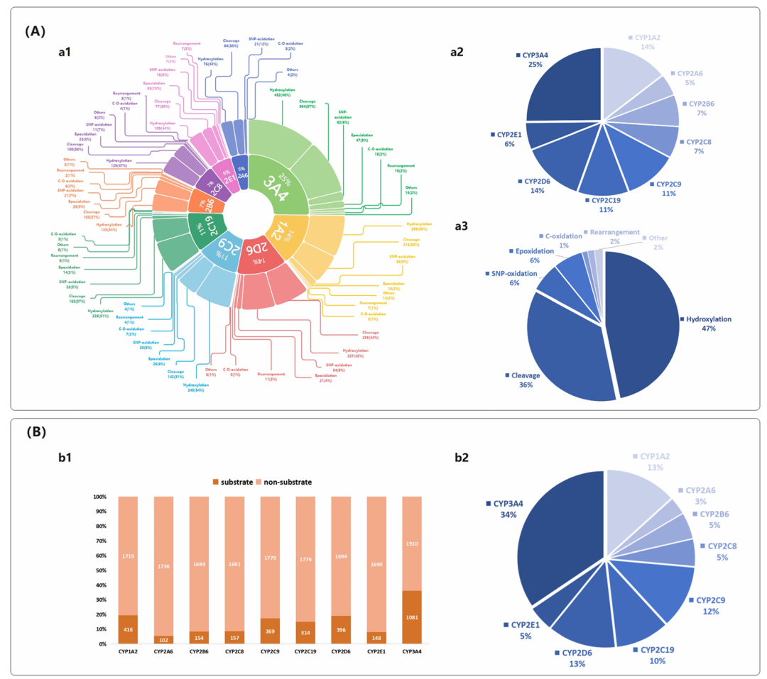 图2. 底物分布与 SOM 数据集特征综合分析。从两个维度解析数据集特征:A 部分聚焦 SOM 训练数据集,a1 子图展示了 CYP450 介导的各类代谢反应占比,a2 子图呈现不同 CYP 亚型在代谢过程中的相对重要性,a3 子图则细化了反应类型的具体分类及占比(如羟基化反应占比最高,约为一半);B 部分分析底物训练数据集,b1 子图对比了各 CYP 亚型的底物与非底物分子数量分布,揭示了数据集中的类别不平衡问题(如 CYP2A6、CYP2E1 的正负样本比不足 1:10),b2 子图通过饼图展示各 CYP 亚型的底物数量占比,其中 CYP3A4 占比 34%,凸显其在药物代谢中的核心地位。此外,配套的 UpSet 图还显示超半数分子可被多种酶代谢,为多任务学习策略提供了数据支撑。