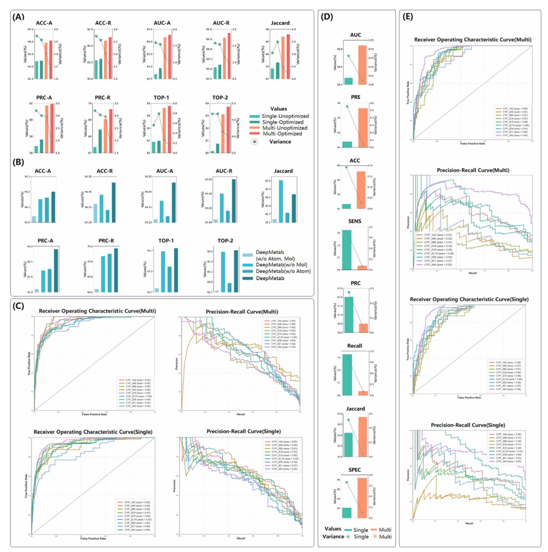 DeepMetab 性能评估。通过多组对比实验验证模型性能:A 子图对比多任务与单任务模型在 SOM 预测中的五折交叉验证结果,橙色(多任务)较绿色(单任务)在 ACC、AUC、Jaccard 等指标上均有 2-3% 提升,且方差更低,PRC-A 指标提升约 5%,深色柱体(优化数据分割)进一步验证了数据均衡对性能的增益;B 子图通过不同蓝色深度展示逐步整合特征的效果,从仅含基础特征到加入原子级、分子级特征,模型性能逐步提升,证明多尺度特征融合的必要性;C 子图为 SOM 预测的 ROC 与 PRC 曲线,多任务模型曲线下面积(AUC)显著大于单任务模型;D 子图与 E 子图则对应底物预测任务,同样证明多任务模型在准确率与稳定性上的优势,其中 D 子图显示多任务模型方差较单任务降低一个数量级。